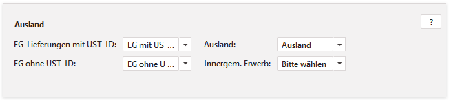 | Ausland | Handelt es sich in der Länderangabe des Rechnungskontos um kein Land der EG, dann ist der hier festgelegte Steuersatz ausschlaggebend für die Rechnungen. Dabei ist die Eintragung einer USt-ID unerheblich. |