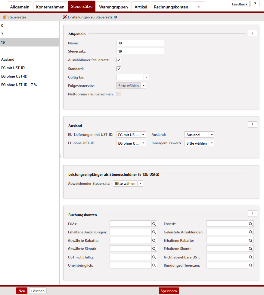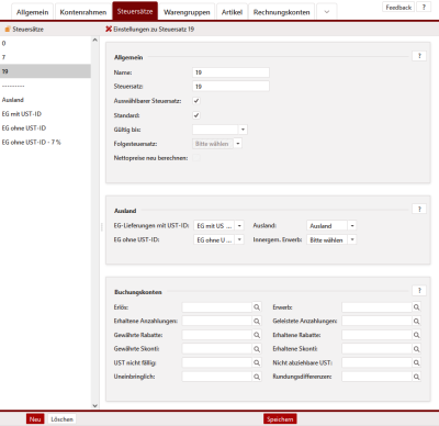 Legen Sie in einem ersten Arbeitsschritt die Steuersätze an, welche Sie auswählen wollen. Für Deutschland sind z.B. 0 %, 7 % und 19 % gängig. Treffen Sie für diese Steuersätze Ihre gewünschten Einstellungen.