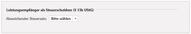 Wird anhand § 13b UStG das Reverse-Charge-Verfahren innerhalb Deutschlands für Bauleistungen zwischen Unternehmen verwendet, müssen Sie im Abschnitt Leistungsempfänger als Steuerschuldner (§ 13b UStG) einen zuvor angelegten Steuersatz auswählen. Legen Sie im Vorfeld die entsprechenden anzuwendenden Alternativ-Steuersätze an. In der Regel handelt es sich dabei um Steuersätze, welche sonst nicht auswählbar sind.