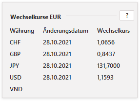 Je nach eingesetzter Währung kann die ausgegebene Liste weitere Einträge von Währungen mit den aktuellen Wechselkursen beinhalten. Die Wechselkurse werden einmal täglich aktualisiert und automatisch von der abgerufen. Alternativ können Sie auch über den Button die aktuellen Wechselkurse beziehen.