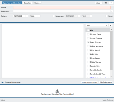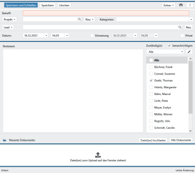 Standardmäßig wird beim Anlegen einer neuen Notiz, Datum und Uhrzeit vorausgefüllt. Diese Felder können Sie ändern. Zusätzlich haben Sie die Möglichkeit, eine Wiedervorlage in Form einer Erinnerung für die zuständigen Mitarbeiter anzulegen. Die Erinnerungszeit, inkl. Datum, wird bei neuen Notizen für alle betreffenden Mitarbeiter gesetzt. Spätere Änderungen gelten nur noch für den aktuellen Bearbeiter.