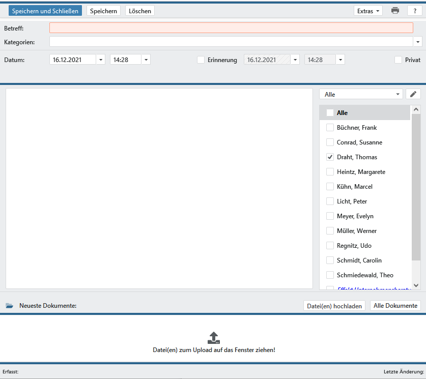Standardmäßig wird beim Anlegen einer neuen Notiz, Datum und Uhrzeit vorausgefüllt. Diese Felder können Sie ändern. Zusätzlich haben Sie die Möglichkeit, eine Wiedervorlage in Form einer Erinnerung für die zuständigen Mitarbeiter anzulegen. Die Erinnerungszeit, inkl. Datum, wird bei neuen Notizen für alle betreffenden Mitarbeiter gesetzt. Spätere Änderungen gelten nur noch für den aktuellen Bearbeiter.