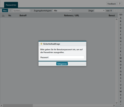 Wenn Sie das Recht besitzen neue Passwörter anzulegen, steht Ihnen dieser Eintrag zur Verfügung, welcher einen neuen Datensatz im Bearbeitungsmodus erzeugt.