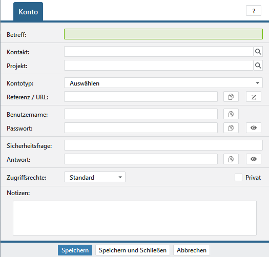 Betreff Der Betreff ist eine kurze Beschreibung des Passwortes und wird direkt in der Suche verwendet. Nutzen Sie prägnante Begriffe und auch Abkürzungen, nach denen ggf. auch gesucht wird.