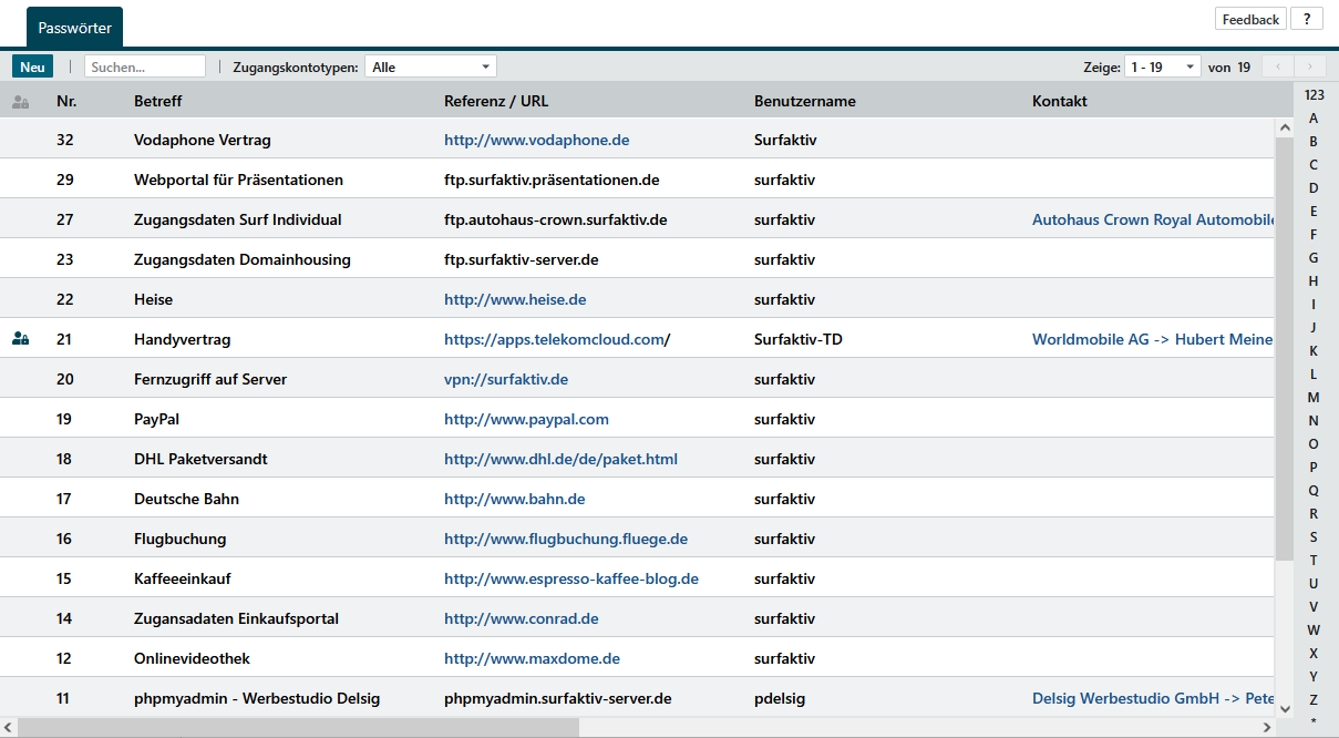 In der Übersicht werden die Passwörter angezeigt, auf die Sie entsprechende Leserechte besitzen. Über die Suchfunktion der Übersicht können Sie nach Begriffen suchen. Diese können mit den Zugangskontotypen kombiniert werden. Die Liste der Zugangskontotypen können berechtigte Administratoren Ihren Bedingungen anpassen.