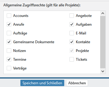 Ausschließlich für externe Benutzer haben Sie die Möglichkeit Zugriffe zum Projekt einzustellen. Alle hier gemachten Einstellungen haben auch auf andere mögliche Projektmitgliedschaften dieses Benutzers Auswirkung.