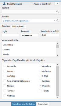 Den Stundenlohn in EUR, den Sie hier pro Nutzer eingeben können, hat Auswirkung auf die Berechnung der angefallenen Projektkosten, die über Aufgaben, Termine und Anrufe entstehen können. Sie können je Person nur einen Stundensatz für das Projekt angeben. Bei Mitarbeitern wird automatisch der in der Administration vorgegebene Stundensatz vorgetragen.