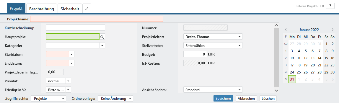 In jedem Fall öffnet sich ein leeres Projektfenster im Bearbeitungsmodus, in dem Sie Ihre Einträge vornehmen können. Nachdem Sie alle relevanten Daten eingegeben haben, bestätigen Sie bitte mit einem Klick auf .