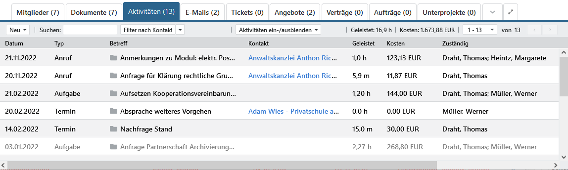 Aktivitäten eines Projektes sind Kommunikationsdaten im klassischen Sinne wie Anrufe, Termine, Aufgaben, Notizen, Tickets und E-Mails. Weitere Daten sind verknüpfte Daten wie Dokumente, Angebote, Verträge und Aufträge.
