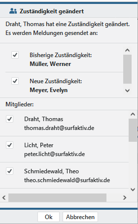 Projekte können im Rahmen der Bearbeitung an andere Projektleiter übergeben werden. Wird z. B. auf Grund von Prozessen ein neuer Projektleiter bestimmt, ist es möglich, diesen über das Feld Projektleiter zu ändern. Wählen Sie einen Benutzer aus der Liste aus und klicken anschließend auf . Es öffnet sich ein Dialog, in dem Sie entscheiden können, ob der ehemalige und ggf. zukünftige Projektleiter und die jeweiligen Projektmitglieder per E-Mail über die Änderung des Projektleiters informiert werden sollen. Sie können individuell je Mitglied entscheiden. Durch Klick auf , werden die markierten Personen mittels E-Mail informiert. Klicken Sie auf , werden keine Informationen versandt.