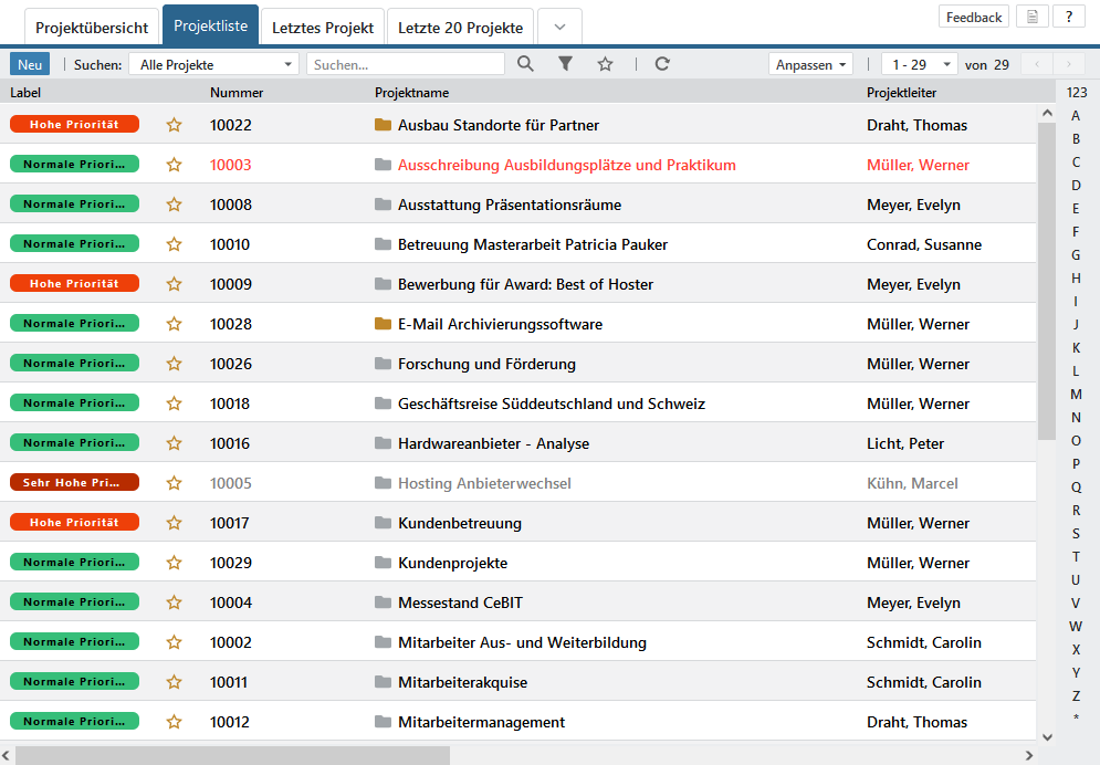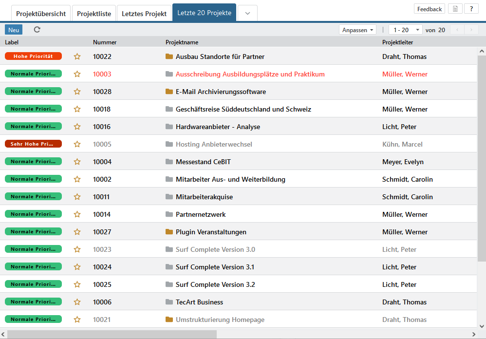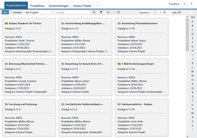 Um in das Modul Projekte zu gelangen, klicken Sie in der Modulleiste auf . Daraufhin öffnet sich ein Fenster mit Registerkarten, darunter auch die Registerkarte , die Ihnen einen Überblick über alle Projekte gibt. Wenn Sie die Registerkarte Letztes auswählen, gelangen Sie zum zuletzt geöffneten Projekt. In der Registerkarte Letzte 20 finden Sie eine Liste der 20 zuletzt geöffneten Projekte.