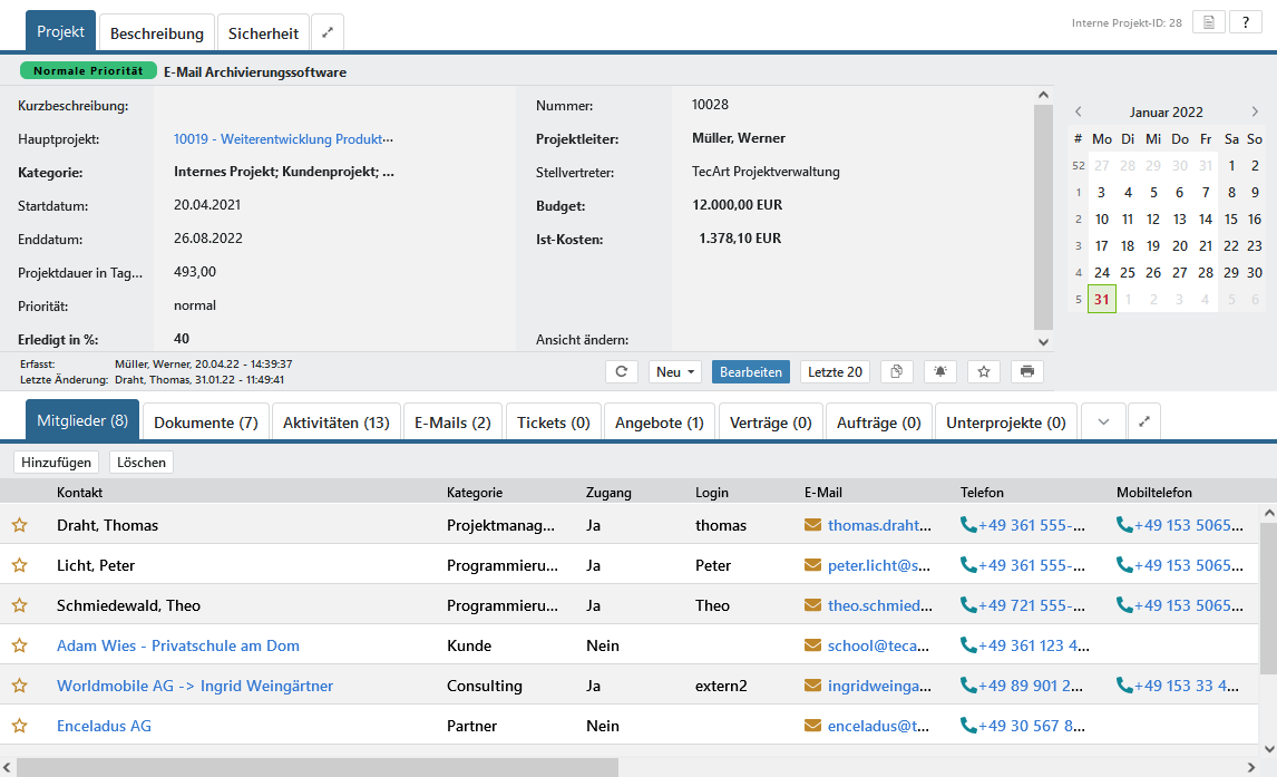 Im Modul erstellen und verwalten Sie Projekte. Dazu wurde dieses Modul ähnlich den Kontakten aufgebaut. Sie werden auch in den Projekten die Verknüpfungen zu Kontakten, Verträgen, Angeboten, Aufträgen, Tickets und den anderen Modulen mit dessen Kommunikationsdaten wieder finden.