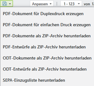 | Die Auswahl ermöglicht Ihnen, die automatisch erstellten PDF-Dateien gepackt als ZIP-Archiv herunterzuladen. Sie haben die Möglichkeit einzelne Datensätze auszuwählen oder alle Dokumente der gefilterten Datensätze zusammenzufassen zu lassen, wenn Sie keinen Datensatz markieren. |