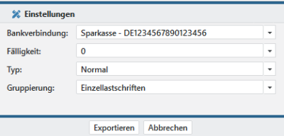 In der Listenansicht der Ausgangsrechnungen können Sie eine SEPA-Einzugsliste herunterladen, indem Sie über das Diskettensymbol die Funktion auswählen. Dabei öffnet sich das Einstellungsfenster, um verschiedene Einstellungen abweichend zu den Standardeinstellungen vornehmen zu können.