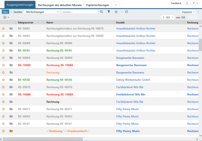 | Orange | Ausgangsrechnungen im Bearbeitungsstand 1 – Erstellt werden orange dargestellt. |