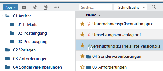 Favoriten, zu erkennen am Stern , sind Objekte, Ordner oder Dokumente, welche Sie als solche markiert haben. Dabei werden zwei Funktionen über die Markierung ausgeführt. In Objekten können Sie solche als Favorit markieren und gleichzeitig auch danach Filtern. Die Markierung können Sie auch direkt an Ordnern und Dokumenten vornehmen. Darüber hinaus werden Dateien und Ordner dieser Elemente über den TecArt Starter und der TecArt-Drive-Funktion mit Ihrem lokalen Explorer synchronisiert, wenn Sie diese Funktion im TecArt-Starter eingeschaltet haben.
