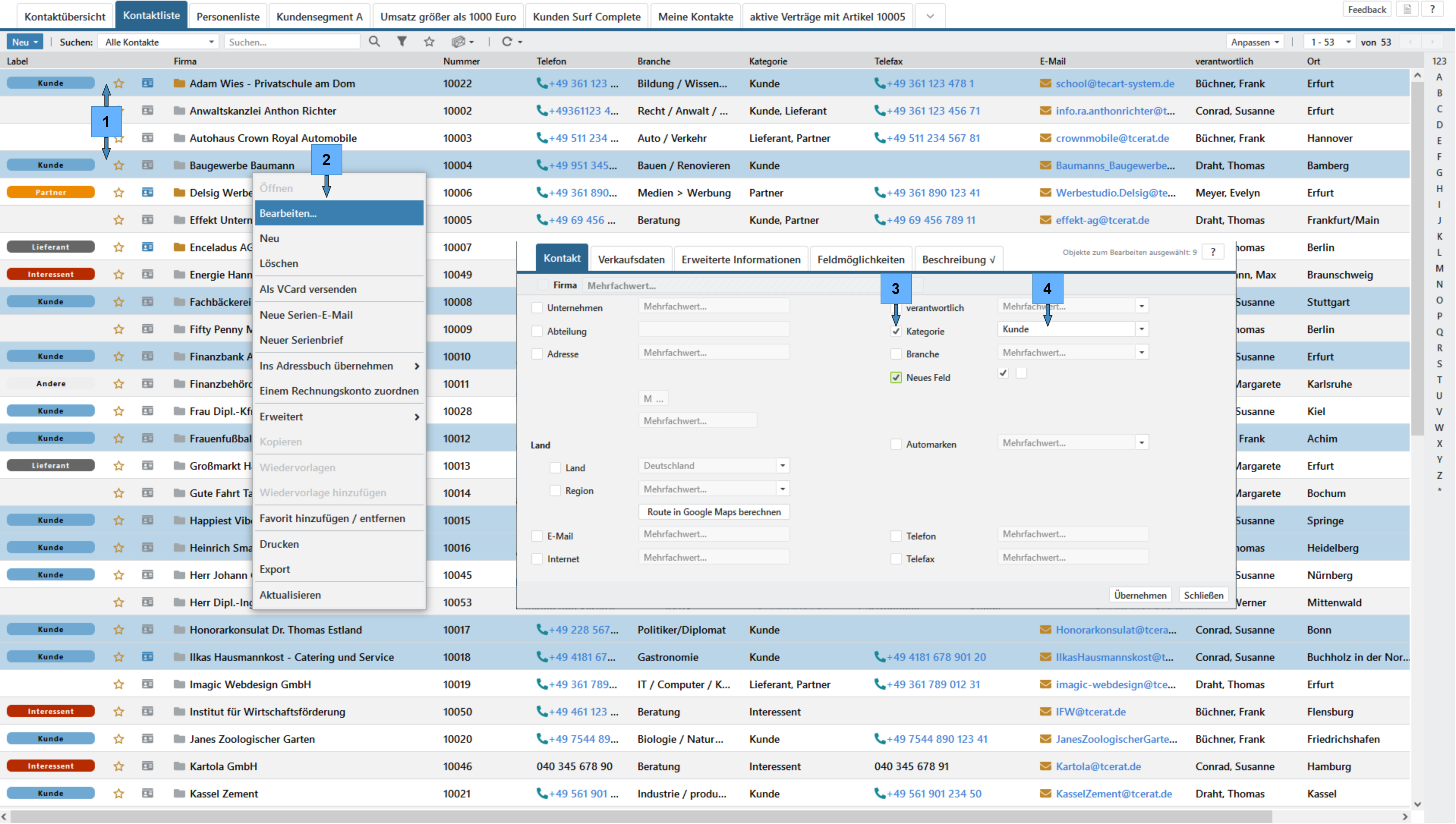 Steht Ihnen die Funktion der Massenbearbeitung zur Verfügung, haben Sie die Möglichkeit, gleichzeitige Änderungen an mehreren Datensätzen vorzunehmen. Die Massenbearbeitung ist in allen Objekten, wie Kontakten, Projekten, Rechnungen etc. sowie in den Aktivitäten wie Termine, Aufgaben, Anrufen und Notizen verfügbar. In der Dokumentenverwaltung hilft Ihnen ein Assistent.