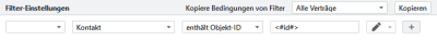 Wählen Sie im Abschnitt Filter-Einstellungen das Standard-Kontaktverknüpfungsfeld (Kontakt) aus. Im nächsten Schritt treffen Sie die Auswahl enthält Objekt ID. Als letztes wählen Sie über den Button interne ID. Die ID ist dafür zuständig, den entsprechenden Kontakt zu identifizieren und trägt in das Feld <#id#> ein.