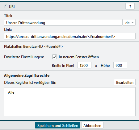 Durch Klick auf öffnet sich ein neues Fenster. Tragen Sie im Feld Titel die Bezeichnung ein, die später auf der Registerkarte erscheinen soll. Das Feld Link enthält die vollständige URL Ihres Links, also inklusive http://, https:// etc. Wenn Sie das Checkfeld In neuem Fenster öffnen aktivieren, wird durch Klick auf die Registerkarte die Verlinkung in einem neuen Fenster geöffnet. Für diesen Fall sollten Sie in die Felder Breite in Pixel und Höhe Daten eintragen. Im Abschnitt Allgemeine Zugriffsrechte können Sie festlegen, für welche Gruppen der Reiter sichtbar sein soll. Klicken Sie auf den Button und markieren Sie die gewünschten Gruppen.