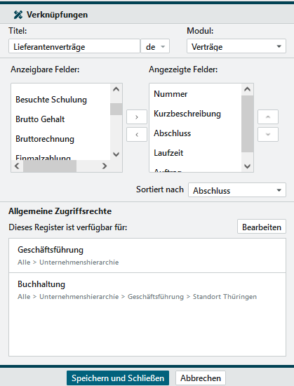 Haben Sie das Fenster für eine neue Verknüpfung geöffnet, können Sie einen Titel, das Modul, die Sortierung, die angezeigten Felder festlegen sowie die Gruppen auswählen, die eine entsprechende Einsicht auf die Verknüpfung erhalten sollen.