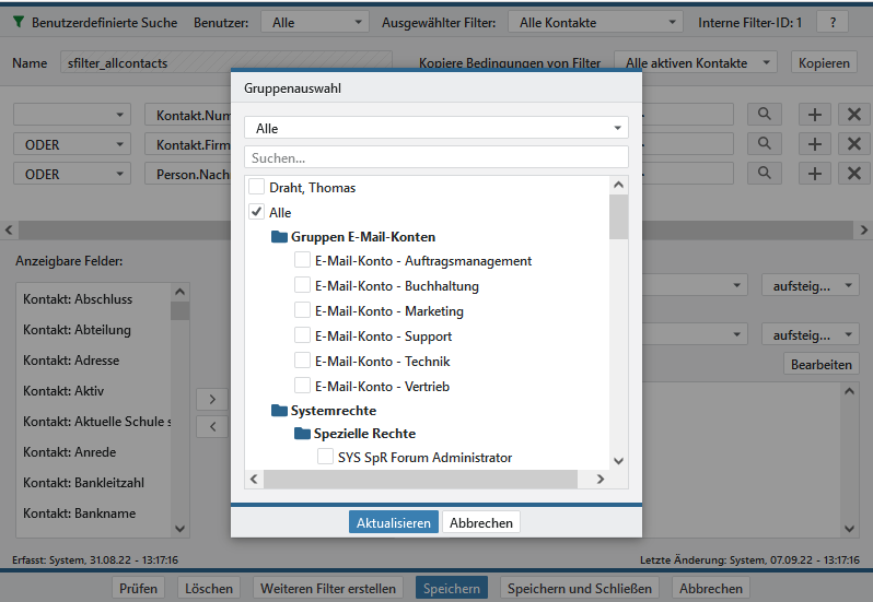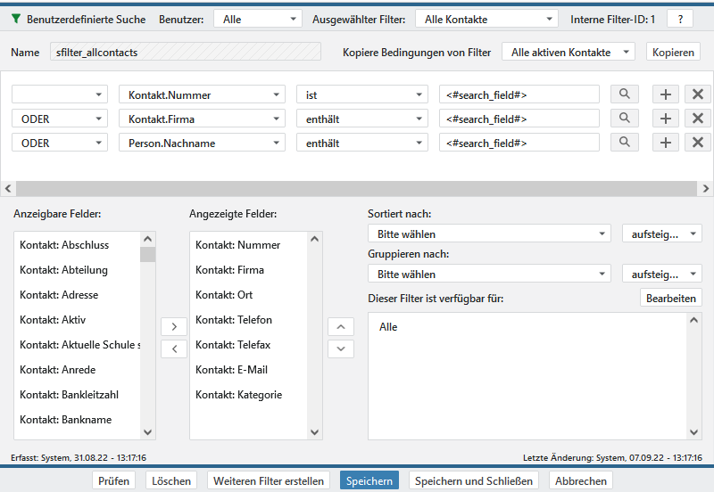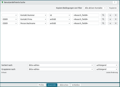 Sie können Ihren Filter individuell einstellen und dabei alle Felder eines Moduls in die Suchen einbinden sowie diese mit verschiedenen Operatoren verbinden.