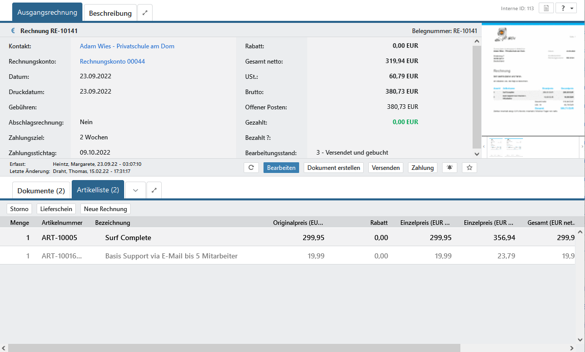 Im unteren Bereich der Ausgangsrechnungen finden Sie viele Registerkarten mit weiteren Informationen der Ausgangsrechnung. Auch diese Ansicht mit der Anzahl und Reihenfolge der Registerkarten kann sich von Ihrer persönlichen Ansicht unterscheiden.