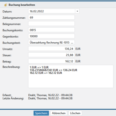 - Eine Überzahlungen entstehen, wenn eine weitere Zahlung auf eine bereits bezahlte Rechnung/Gutschrift eingetragen wird > es erfolgt keine Verbuchung auf neue noch folgende Rechnungen > man muss dies selber vornehmen und Teilzahlungen eintragen. Hierfür bietet sich ein Geldtransfer-Konto an.