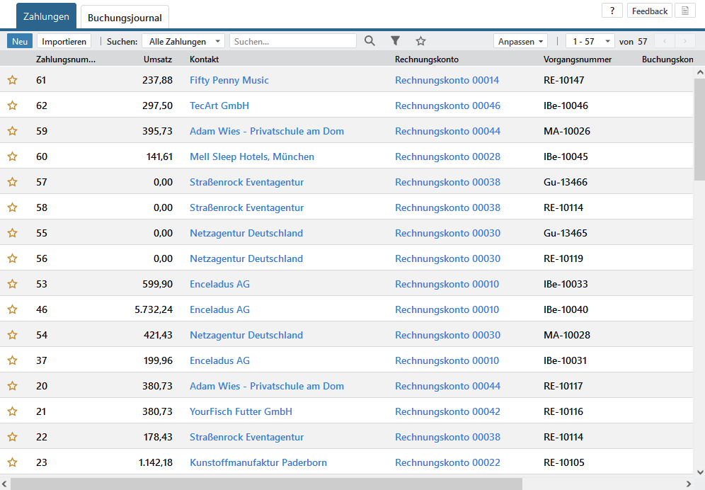 - Überzahlungen entstehen auch, wenn mit einer Zahlung mehrere offene Rechnungen beglichen werden. Dabei werden die überzahlten Beträge auf eine Rechnung automatisch solange auf weitere offene Rechnungen übergeben, bis es keine offenen Rechnungen mehr gibt. Tritt dieser Fall ein, bietet sich für spätere Umbuchungen auf folgende Rechnungen ebenfalls das Geldtransfer-Konto an.