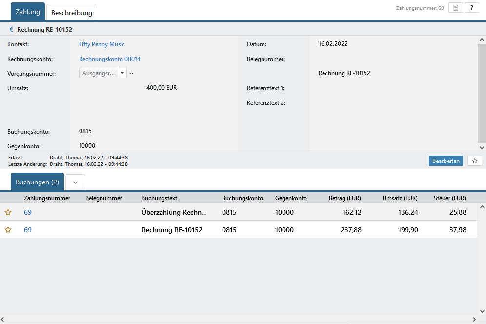 - Eine Überzahlungen entstehen, wenn eine weitere Zahlung auf eine bereits bezahlte Rechnung/Gutschrift eingetragen wird > es erfolgt keine Verbuchung auf neue noch folgende Rechnungen > man muss dies selber vornehmen und Teilzahlungen eintragen. Hierfür bietet sich ein Geldtransfer-Konto an.