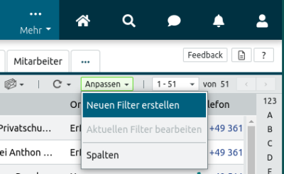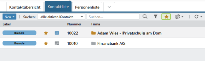 Möchten Sie z.B. im Filter Alle Kontakte nach dem Suchbegriff München suchen, werden Ihnen im Standardfilter aktuell nur alle Kontakte angezeigt, die im Firmennamen München enthalten. Unternehmen am Standort München hingegen nicht.