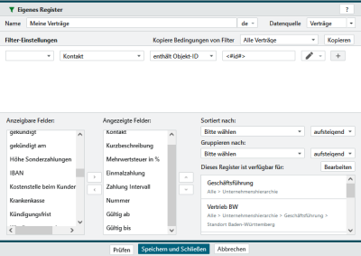 Möchten Sie Informationen über die unteren Registerkarten in bestimmten Modulen ausgeben, so ist dies über die Standardverknüpfungfelder möglich, die in zahlreichen Modulen des TecArt CRM vorhanden sind. Möchten Sie bspw. die Standard-Vertragsregisterkarte kopieren und durch zusätzliche Felder erweitern, so erläutern wir Ihnen dies anhand des nachfolgenden Beispiels. Wir werden alle Verträge zu dem zugehörigen Kontakt, in einem Kontakt ausgeben.