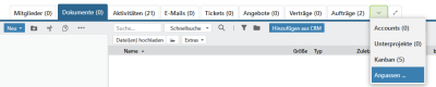 Solche Registerkarten lassen sich auch innerhalb der Objekte, wie bspw. einem Kontakt, Projekt, Ticket, anlegen. Auch dort haben Sie im Bereich der unteren Registerkarten als letzten Eintrag die drei Punkte . Bitte klicken Sie ihn an und wählen den Menüeintrag . Es öffnet sich ein neues Fenster mit verschiedenen Einstellungsmöglichkeiten.