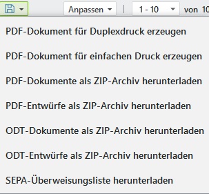 | Die Auswahl ermöglicht Ihnen, die automatisch erstellten PDF-Dateien gepackt als ZIP-Archiv herunterzuladen. Sie haben die Möglichkeit einzelne Datensätze auszuwählen oder alle Dokumente der gefilterten Datensätze zusammenzufassen zu lassen, wenn Sie keinen Datensatz markieren. |