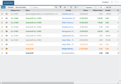 | Orange | Gutschriften im Bearbeitungsstand 1 – Erstellt sind orange eingefärbt. Diese werden im nächsten Schritt zur Prüfung abgegeben. |