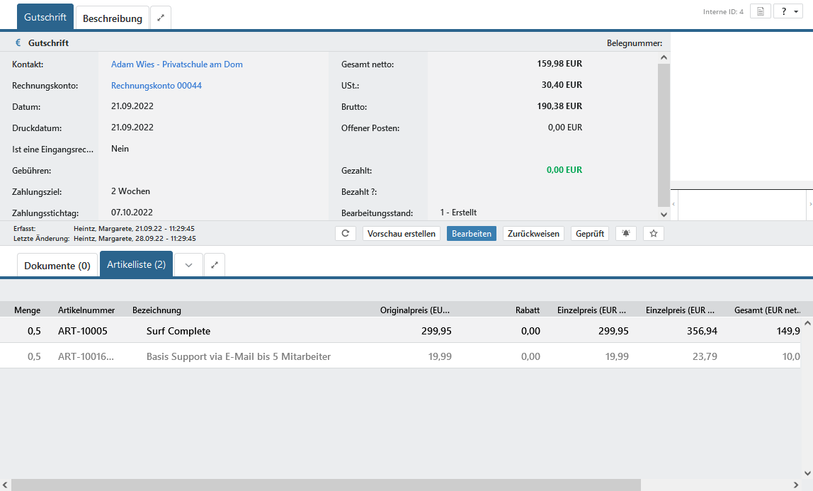 | Schwarz | Im Bearbeitungsstand 0 – in Bearbeitung und 7 – Abgeschrieben wird die Gutschrift schwarz dargestellt. |