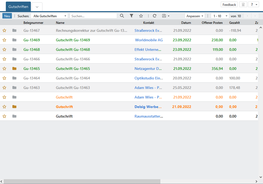 | Grau | Gutschriften im Bearbeitungsstand 4 – Bezahlt und 6 – Storniert werden grau dargestellt. |