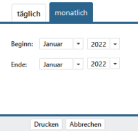 | Über diesen Button öffnet sich ein weiteres Dialogfenster, welches es ermöglicht, einen Zeitraum für den Druck des Kassenbuches festzulegen. Gewählt werden kann dabei zwischen einem Tages-Ausdruck und einem Monats-Ausdruck. Dies ist abhängig von der Anzahl Ihrer Kassenbucheinträge, die erfasst werden und sollte mit Ihrem Steuerberater abgestimmt sein. Oftmals genügt das monatliche Kassenbuch.