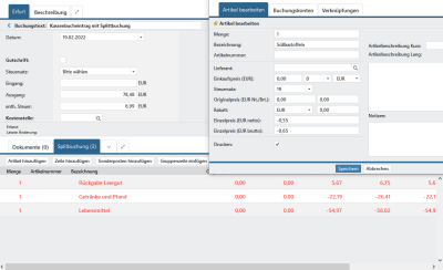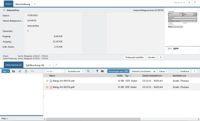 Im unteren Bereich der jeweiligen Eintragung finden Sie viele Registerkarten mit weiteren Informationen des Kassenbucheintrags. Auch diese Ansicht mit der Anzahl und Reihenfolge der Registerkarten kann sich von Ihrer persönlichen Ansicht unterscheiden.