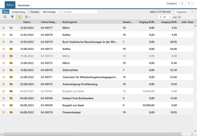 Das Kassenbuch stellt die digitale Version Ihres Kassenbuchs dar. Hier können Sie Ein- und Auszahlungen vermerken, sowie den aktuellen Saldo abrufen.