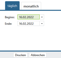 | Über diesen Button öffnet sich ein weiteres Dialogfenster, welches es ermöglicht, einen Zeitraum für den Druck des Kassenbuches festzulegen. Gewählt werden kann dabei zwischen einem Tages-Ausdruck und einem Monats-Ausdruck. Dies ist abhängig von der Anzahl Ihrer Kassenbucheinträge, die erfasst werden und sollte mit Ihrem Steuerberater abgestimmt sein. Oftmals genügt das monatliche Kassenbuch.