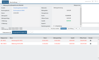 Über einen Doppelklick auf eine verknüpfte Ausgangsrechnung bzw. Mahnung wird der entsprechende Vorgang angezeigt. Während der Erstellung der neuen Mahnung können Sie auf dieser Registerkarte über das Kontextmenü > nicht gewünschte Vorgänge aus der Mahnung entfernen.