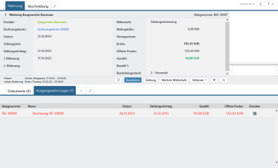 | Mahngebühr | Summe der aktuellen Mahngebühren für den Vorgang. Dabei erhöht sich die Mahngebühr ggf. automatisch je Mahnstufe, wenn Sie mehr als eine Stufe verwenden. |