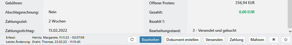 | 3. Mahnung | Datum der dritten erstellten Mahnung. Ist es bei Ihnen nicht üblich mehr als zwei Mahnstufen zu verwenden, so kann Ihr Administrator entsprechende Anpassungen vornehmen und das Feld ausblenden. |