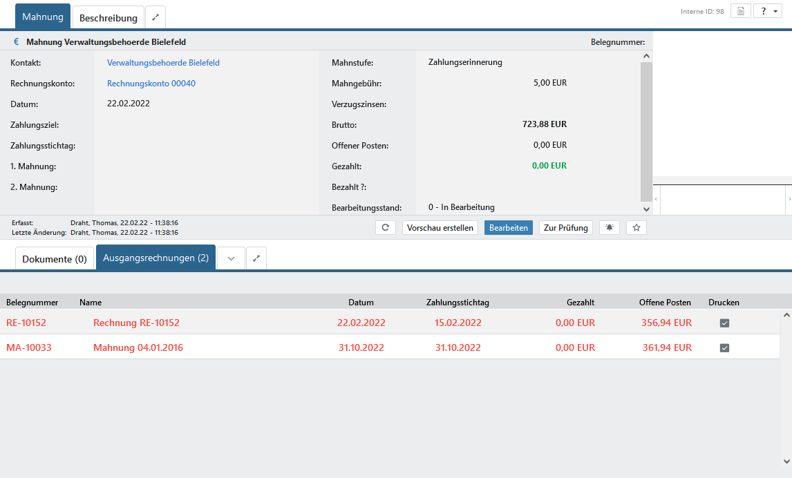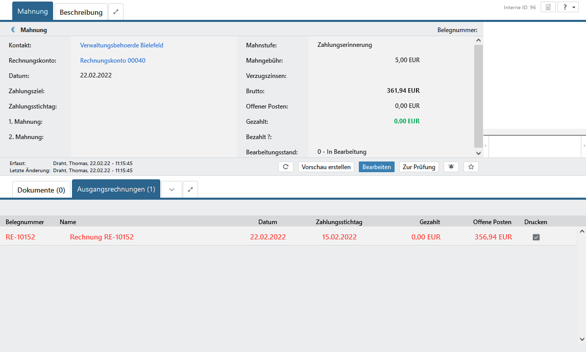 Direkt nach dem Klick auf den Button wird dieser Datensatz zurückgesetzt in den Status 0 – In Bearbeitung und im Feld Mahnstufe wird die nächste höhere Mahnstufe angegeben.