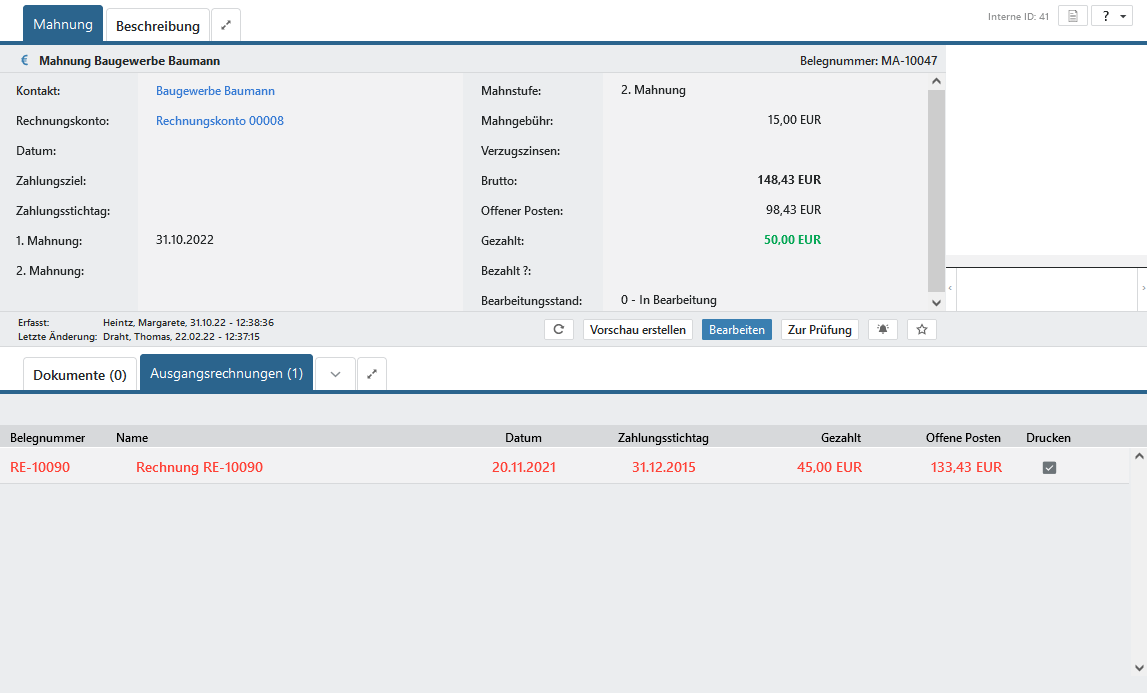 Um eine bereits bestehende Mahnung zu bearbeiten, öffnen Sie diese durch einen Doppelklick und betätigen den Button . Die Mahnung wechselt daraufhin in den Bearbeitungsmodus, in dem Sie die gewünschten Änderungen vornehmen können. Sobald Sie mit den Einträgen zufrieden sind, beenden Sie den Bearbeitungsmodus über . Die Möglichkeit der Bearbeitung steht in den Bearbeitungsständen 0 – In Bearbeitung, 1 – Erstellt und 2 – Geprüft zur Verfügung. Ab Status 3 – Freigegeben können aus rechtlichen Gründen generell keine Änderungen mehr vorgenommen werden, mit Ausnahme von nicht GoBD-relevanten Feldern.