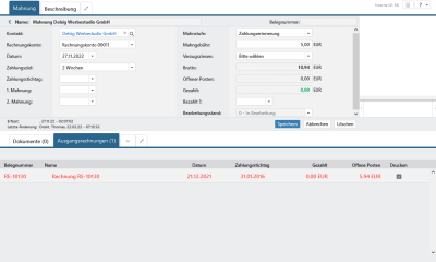 | Kontakt | Ist ein Pflichtfeld und verknüpft den Kontakt mit der Mahnung. Dieser wird bereits beim Erstellen aus einem anderen Vorgang automatisch ausgefüllt. |