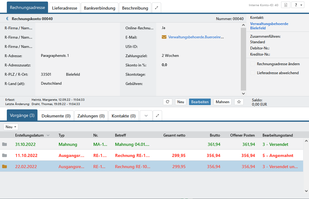 Wechseln Sie aus einer offenen und überfälligen Ausgangsrechnung oder Mahnung direkt über den Link im Feld Rechnungskonto in die Vorgangsübersicht dieses Kunden.