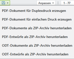 | Die Auswahl ermöglicht Ihnen, die automatisch erstellten ODT-Dateien gepackt als ZIP-Archiv herunterzuladen. Sie haben die Möglichkeit, einzelne Datensätze auszuwählen oder alle Dokumente der gefilterten Datensätze zusammenzufassen zu lassen, wenn Sie keinen Datensatz markieren. |