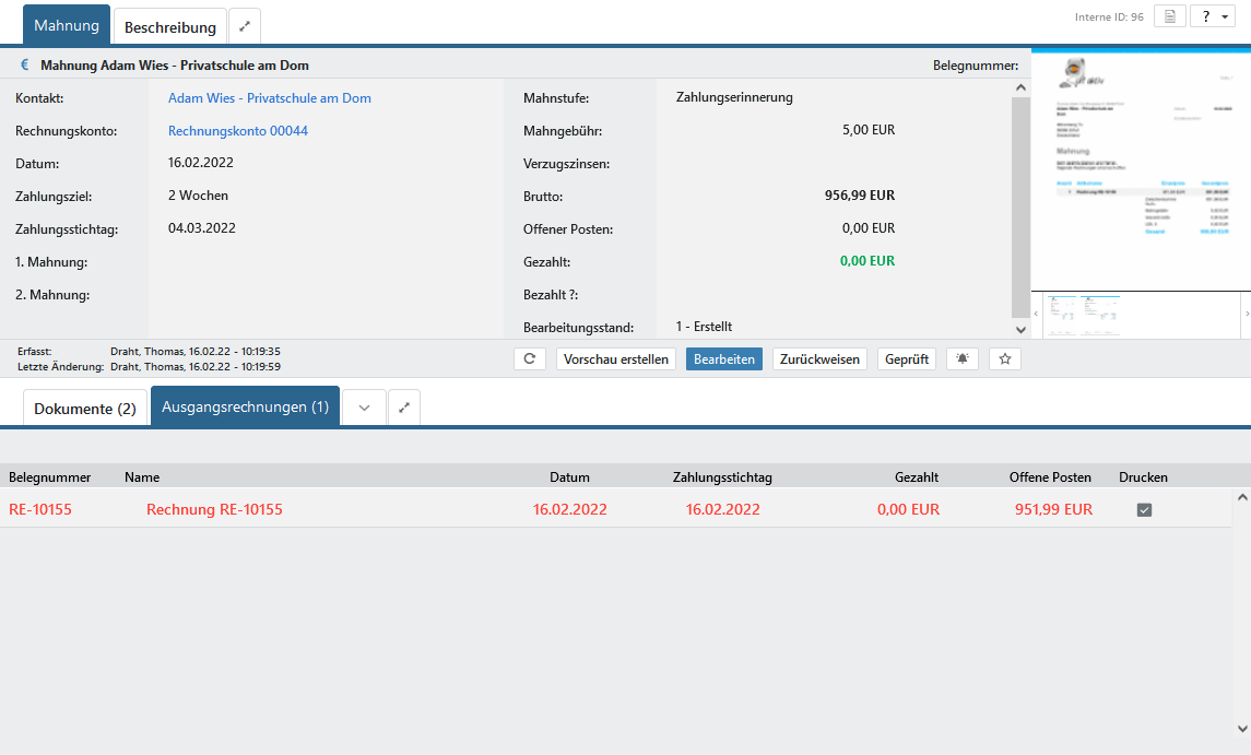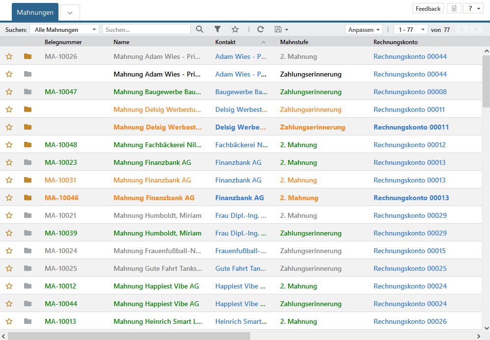 | Orange | Mahnungen im Bearbeitungsstand 1 – Erstellt sind orange eingefärbt. Diese werden im nächsten Schritt zur Prüfung abgegeben. |