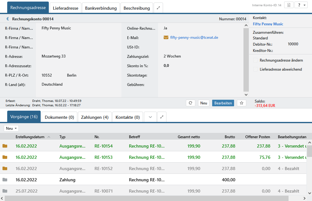 Die Rechnungskonten stellen den Dreh- und Angelpunkt für das Rechnungsmodul dar. Im Rechnungskonto werden u.a. Einträge für Rechnungsadressen und Lieferadressen, Einstellungen von Fristen und Zahlungsarten, sowie eine Übersicht für alle Vorgänge gepflegt. Diese Einträge können in Angeboten, Aufträgen, Verträgen und den Vorgangsarten im Rechnungsmodul verwendet werden. Jeder Kontakt kann dabei mehrere Rechnungskonten mit unterschiedlichen Rechnungsadressen und Lieferadressen, sowie verschiedene Zahlungsbedingungen besitzen.